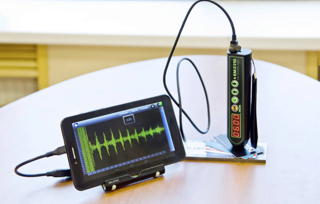 连接平板电脑、智能手机或其他基于 Android 的设备,可以将 EM2210 厚度计的功能扩展到现代探伤仪的水平,能够显示和保存 A 扫描和 B 扫描,使用频闪灯,选择厚度测量模式、信号处理参数等等。