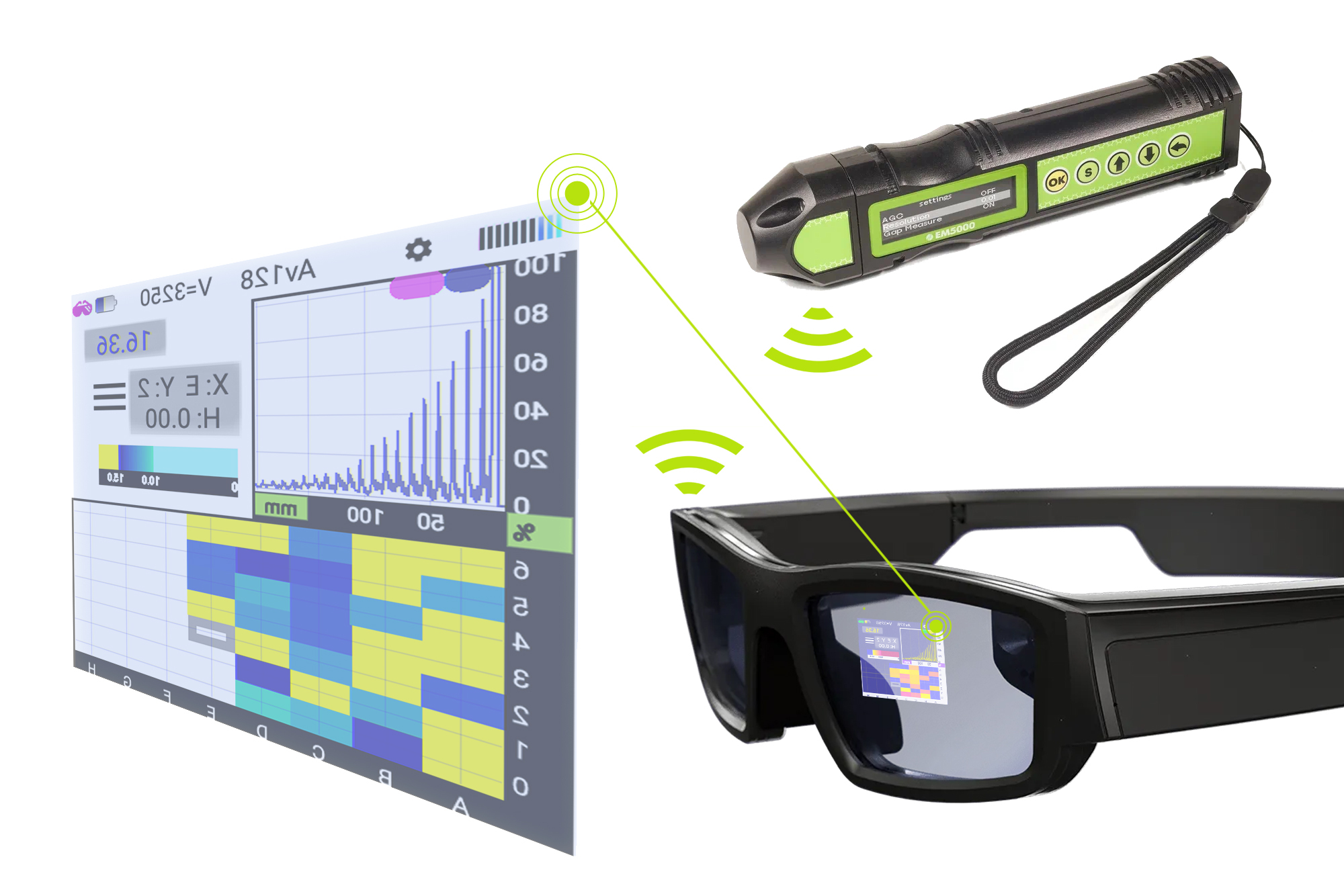 连接平板电脑、智能手机或其他基于 Android 的设备,可以扩展 EM5000 的功能:分析 A 扫描、B 扫描、使用频闪灯、选择厚度测量模式、信号处理参数等。EM5000 通过蓝牙连接到平板电脑。