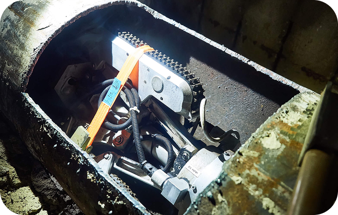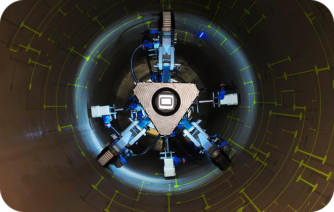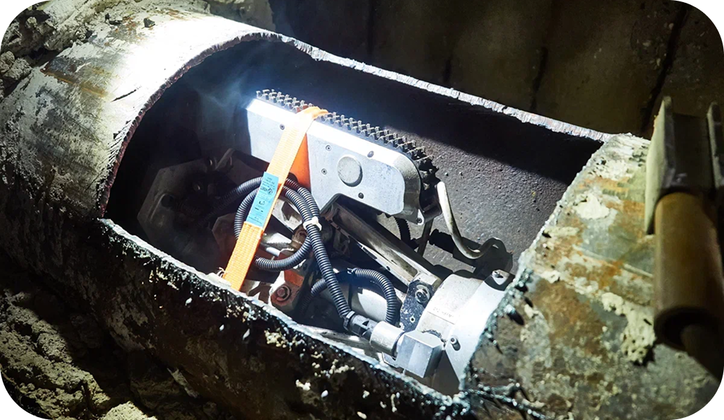 In contrast to the ultrasonic test method, this method is insensitive to pipe surface irregularities caused by corrosion. The robot measures the residual thickness of the metal pipe wall in areas inaccessible for other inspection methods due to deposits and severe corrosion.