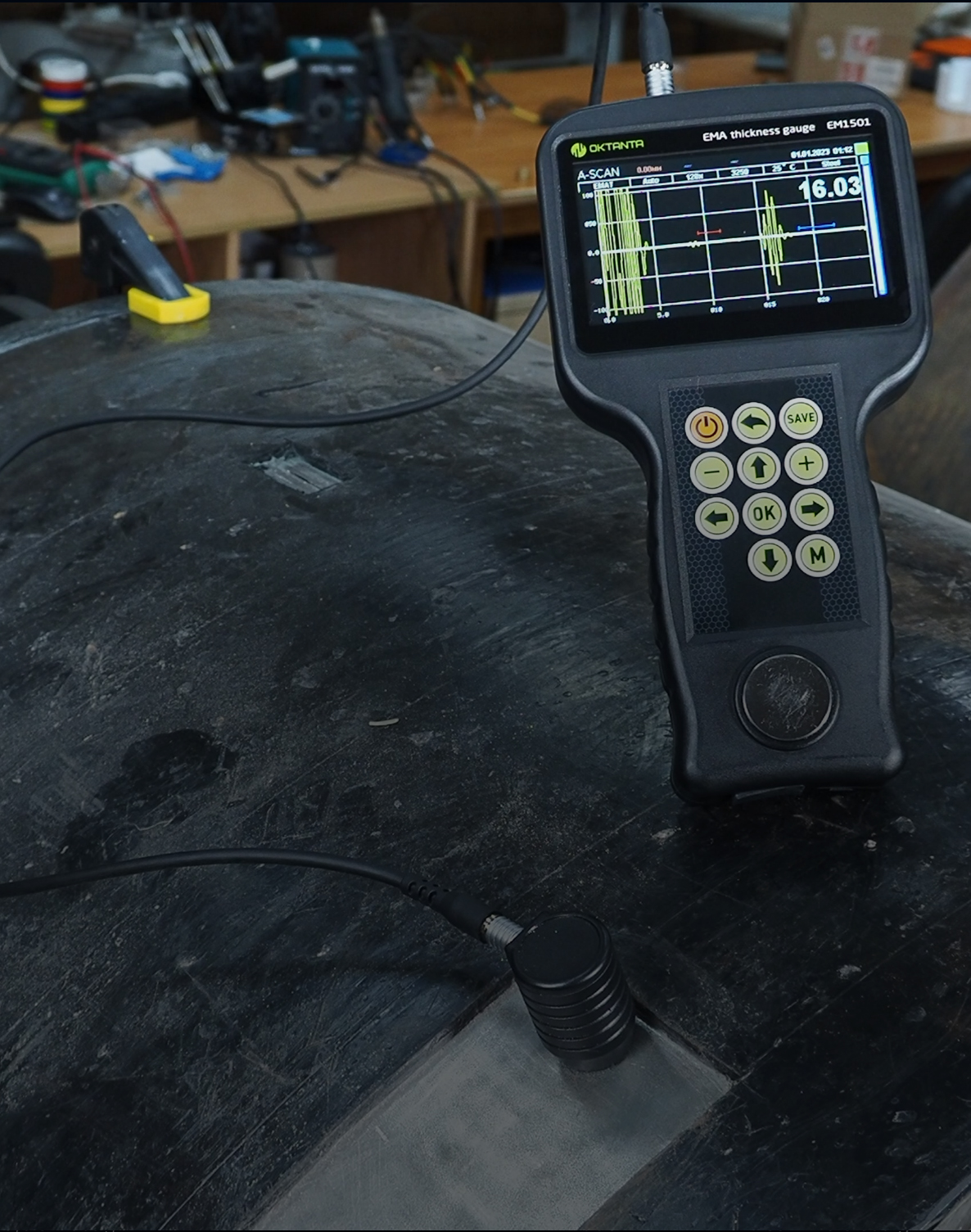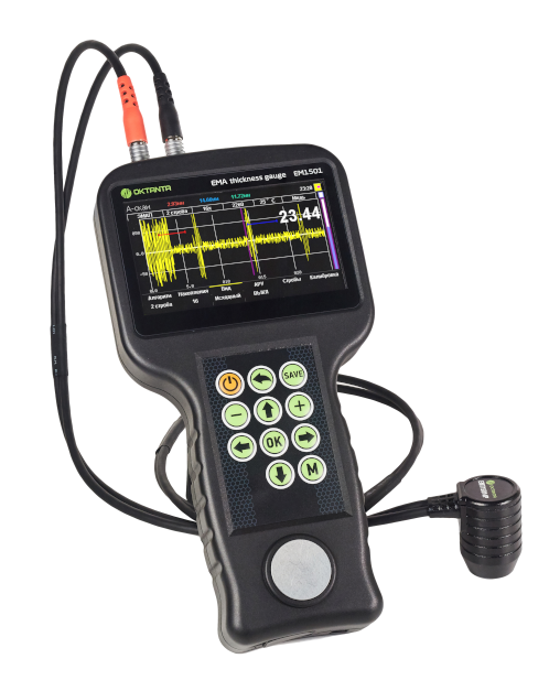 The EM1501 is based on the latest scientific developments in the field of non-destructive testing and the extensive experience of Oktanta engineers. The device measures thickness of the metal through a gap of up to 7 mm (the largest value compared to the other EMA thickness gauges).